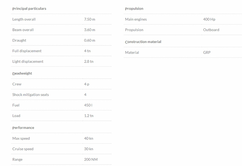 | 總長: | 7.50m | 航速: | 40kn |