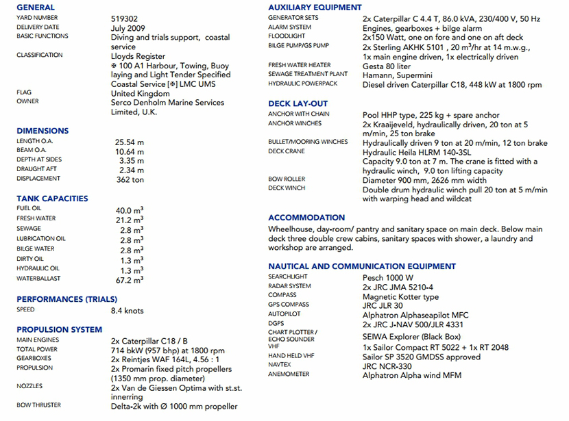 發動機功率: 714bkW at 1800rpm 推進裝置: 2×Promarin fixed pitch propellers