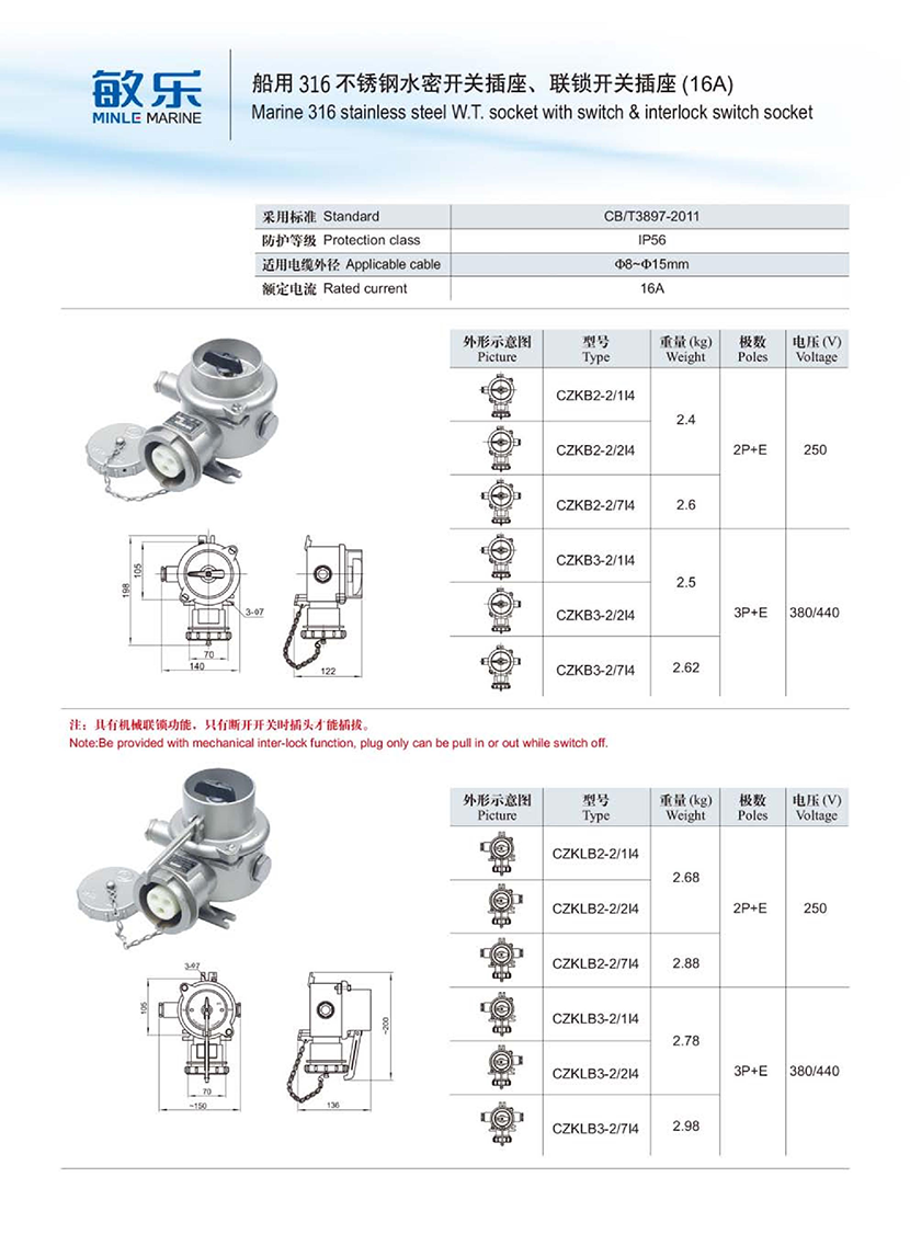 船用316不銹鋼水密聯鎖開關插座(16A)
