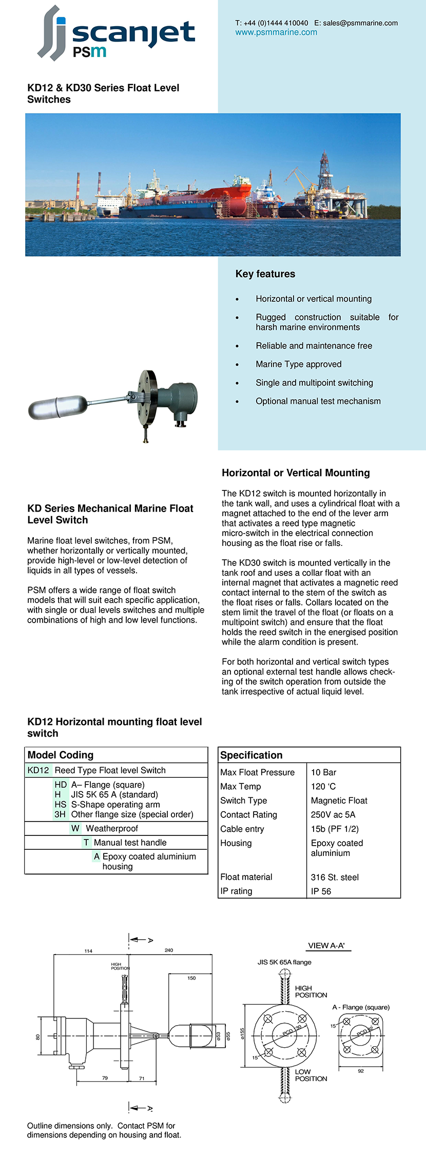 性能亮點: Rugged construction suitable for harsh marine environments;Reliable and maintenance free; Detection of liquids in all typles of vessels; Resistant to corrosion; Checking of the switch operation from outside the tank irrespective of actual liquid level 防護等級: IP56