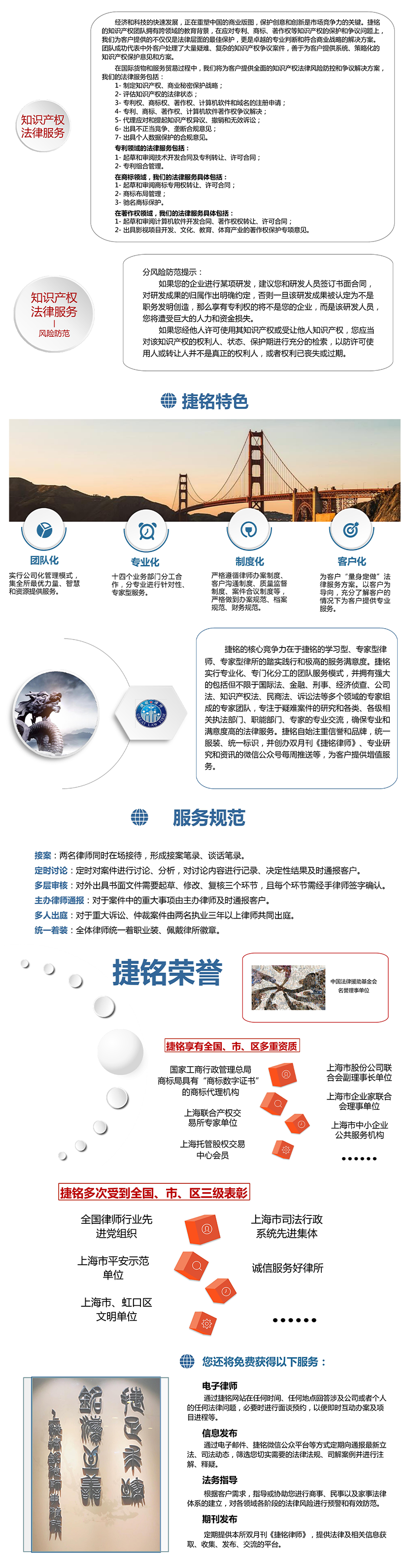 榮譽表彰: 中國法律援助基金會名譽理事單位;全國律師行業先進黨組織;上海市平安示范單位;上海市虹口區文明單位;上海市司法行政系統先進集體;誠信服務好律所等 計費方式: 計件收費;按標的額比例收費;計時收費;按階段收費