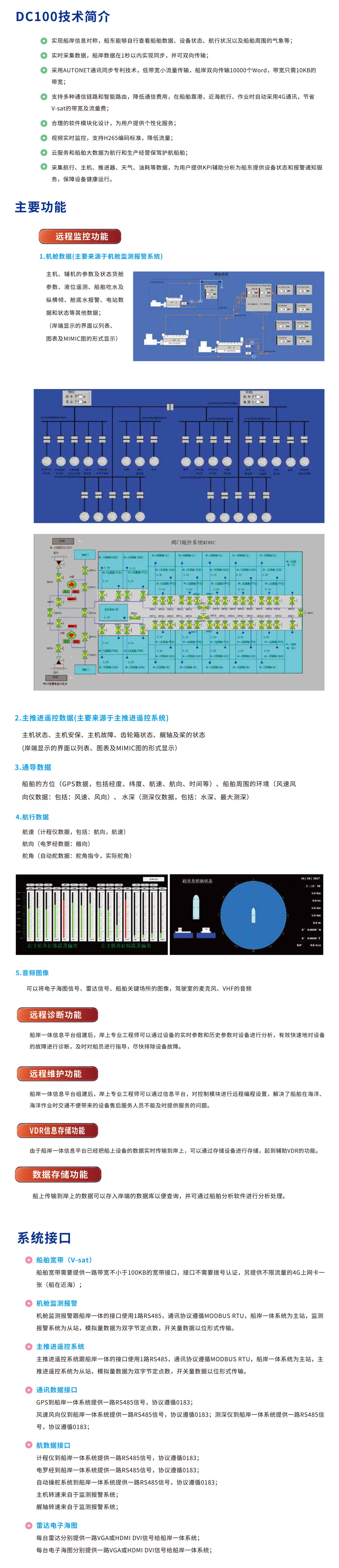 | 應用場景: | 對?船舶基本信息進行管理;實現?船舶設備/系統工作數據的實時岸傳;??結合歷史記錄與實時數據,分析判斷船舶設備的運行狀況,有效實施設備的維修保養,降低設備運行風險與成本;??專家可實施遠程診斷、遠程支援;??記錄特定時段的船舶信息,船舶岸站的VDR系統,防范船舶事故與隱患,提高船舶航行安全性;船舶如發生意外,通過系統的歷史記錄還原意外前的數據,為分析事故原因提供依據且分辨責任 | 特性亮點: | 實現船岸信息對稱,船東能夠自行查看船舶數據、設備狀態、航行狀況以及船舶周圍的氣象等;實時采集數據,船岸數據在1秒以內實現同步,并可雙向傳輸;實現低帶寬小流量傳輸;?支持多種通信鏈路和智能路由,降低通信費用,在船舶靠港,近海航行、作業時自動采用4G通訊,節省帶寬及流量費;?合理的軟件模塊化設計,為用戶提供個性化服務;視頻實時監控,支持H265編碼標準,降低流量;??云服務和船舶大數據為航行和生產經營保駕護航;?采集航行、主機、推進器、天氣、油耗等數據,為用戶提供KPI輔助分析,為船東提供設備狀態和報警通知務,保障設備健康運行 |